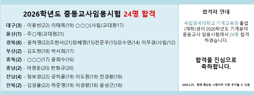 - 2026-0411[장학]2026학년도 지역 취약계층 청소년 학습지원 멘토링 프로그램 참여 멘토 모집국립경국대학교 다문화교육센터에서는 [국립대학육성사업]일환으로 지역 취약계층의 기초학력 향상을 위한 2026학년도 지역 청소년 학습지원 멘토링 프로그램 참여 멘토 모집합니다. 관심 있는 학생분들의 많은 신청바랍니다.1. 모집대상 : 국립경국대학교 재학생(휴학생, 졸업생, 자퇴생 등 제외) 2. 모집인원 : 15명 ※ 모집인원은 운영 상황에 따라 변동될 수 있음 3. 신청자격 : 우리대학 학부 재학생으